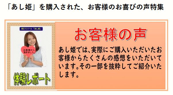 ちょっと大袈裟ですが、本当にあし姫が私の体を変えてくれました。お客様から感謝のお手紙をいただいたり、メールをいただいたりして、あし姫を作って世に出して本当によかったと思っています。