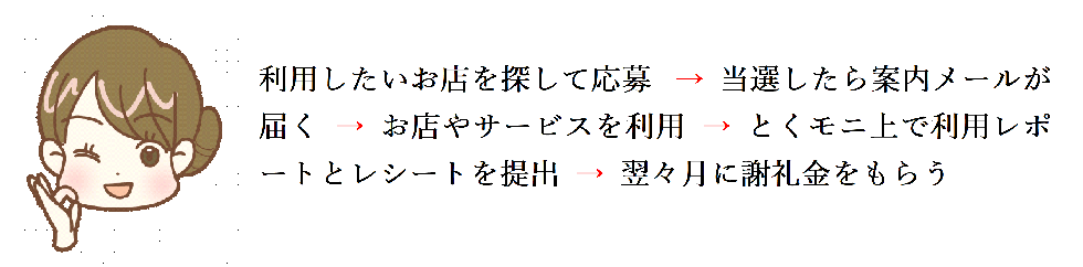 お店としては、実際のお客様の率直な意見を受けてより良くしていくヒントがあり、登録して利用する人はとってはフィードバックする代わりにそのお店やサービスを安く利用できたり、謝礼金を受け取れたりします。