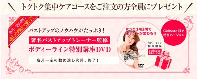 セルノートは「美しいバストを作りたい」とバストケアが気になる方のための商品です。今キャンペーン中なので通常価格7000円が初回限定で無料となっています。また全員に著名バストアップトレーナー監修の「ボディーライン特別講座DVD」を無料でプレゼントしています。