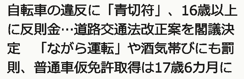 16歳以上の自転車の交通違反に反則金納付を通告できる交通反則切符(青切符)制度の導入を柱とした道交法改正案が5月17日の参院本会議で可決、成立しました。 自転車走行中の携帯電話使用(ながら運転)や酒気帯びに罰則を新設しました。